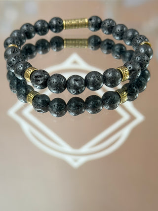 Black Lava Stone Men’s Bracelet – Antique Tibetan Golden Accents