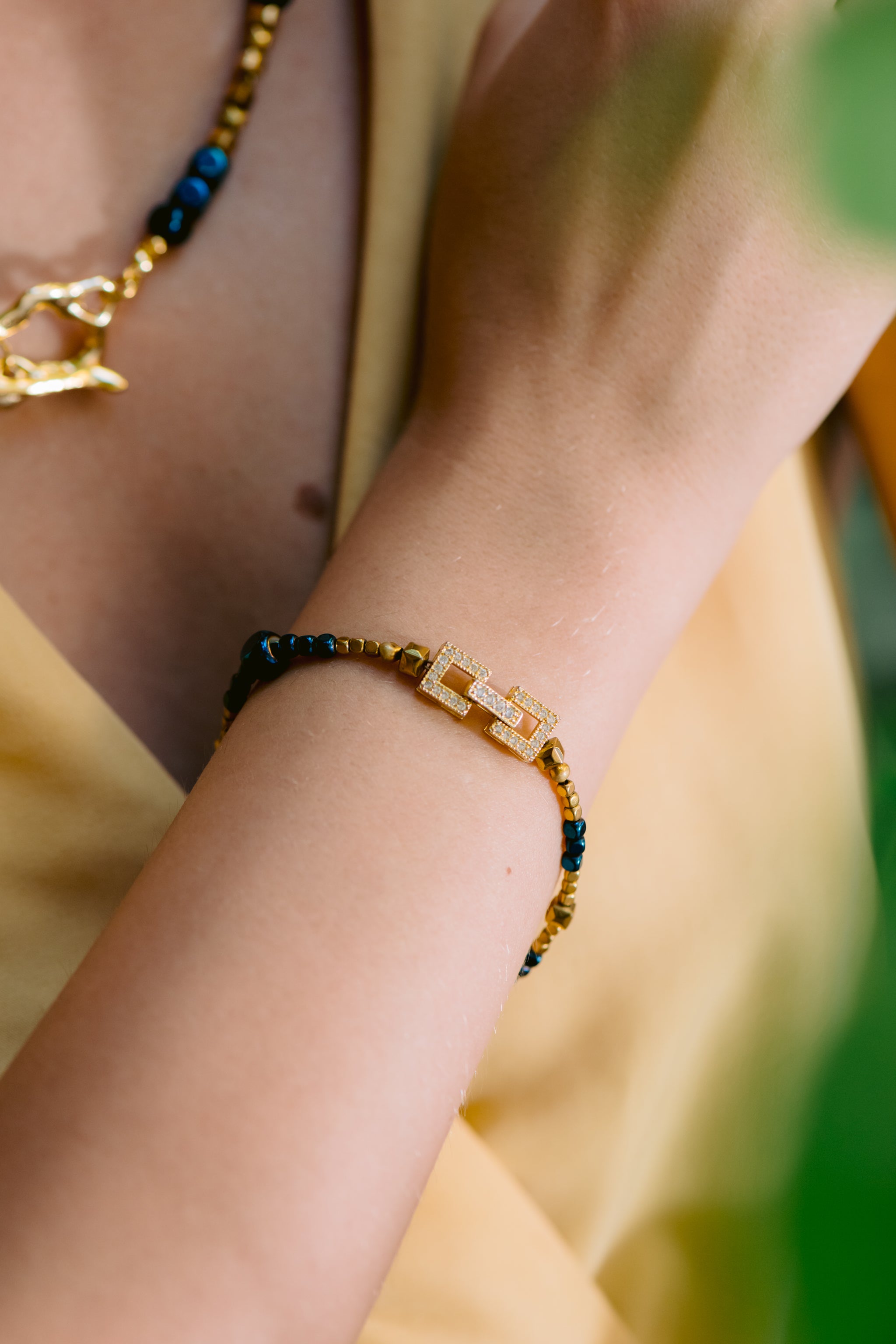 A modern blend of strength and sophistication, this bracelet is crafted with polished blue and gold hematite beads, their metallic luster creating a striking contrast. At its center, a bold gold-plated geometric clasp sparkles with refined detail, making it both secure and stylish.