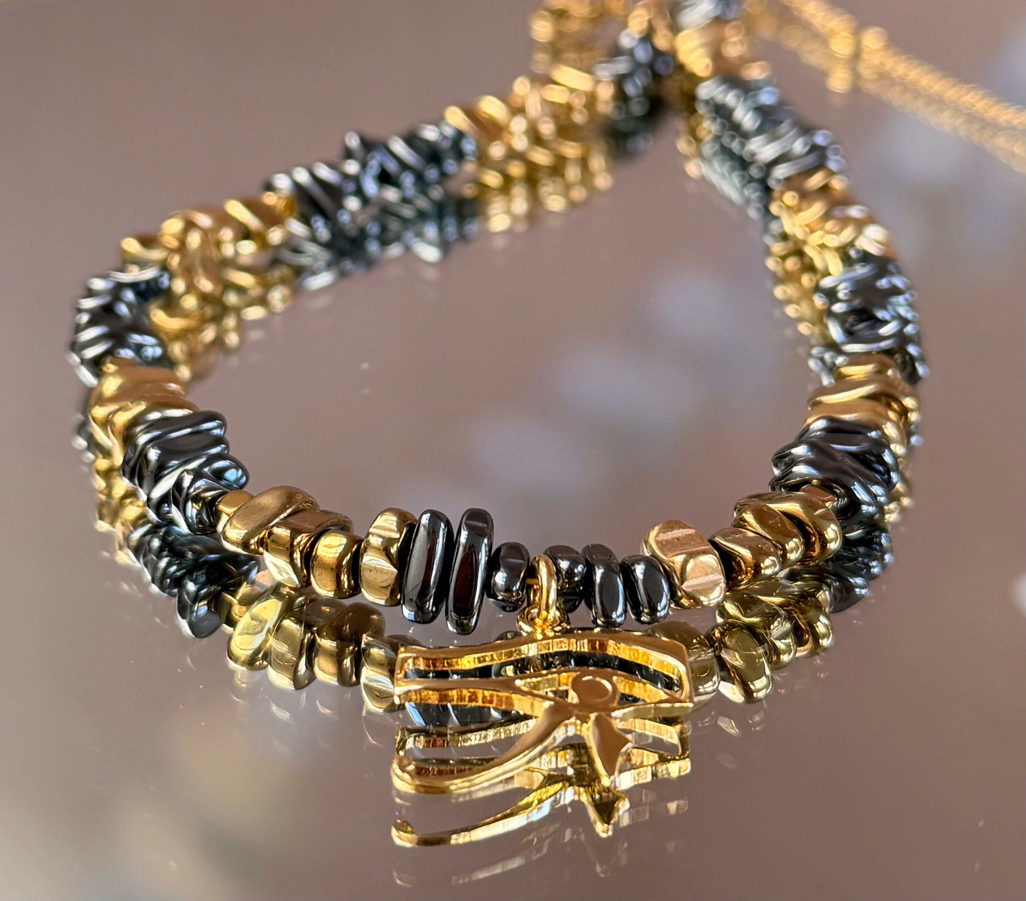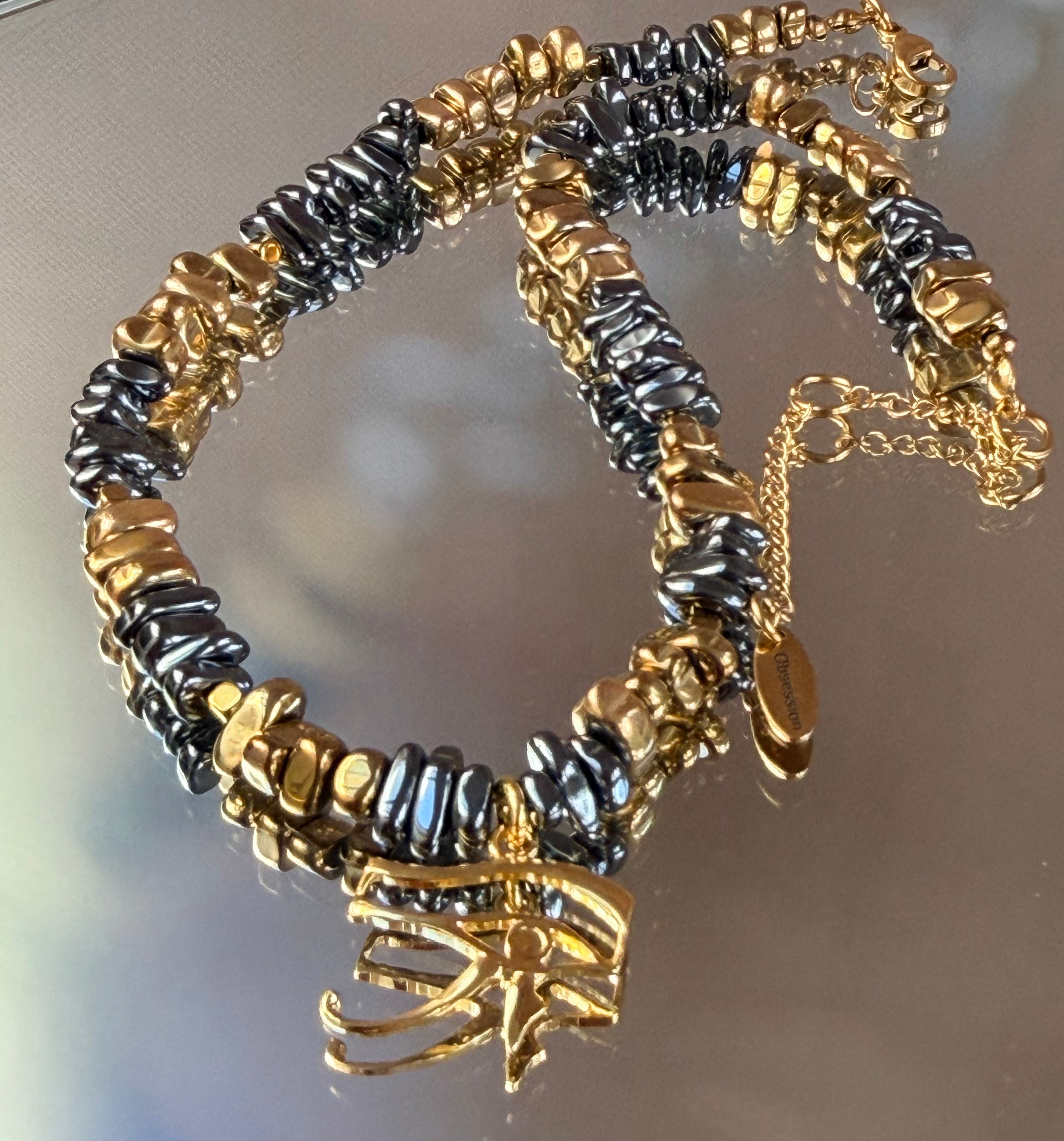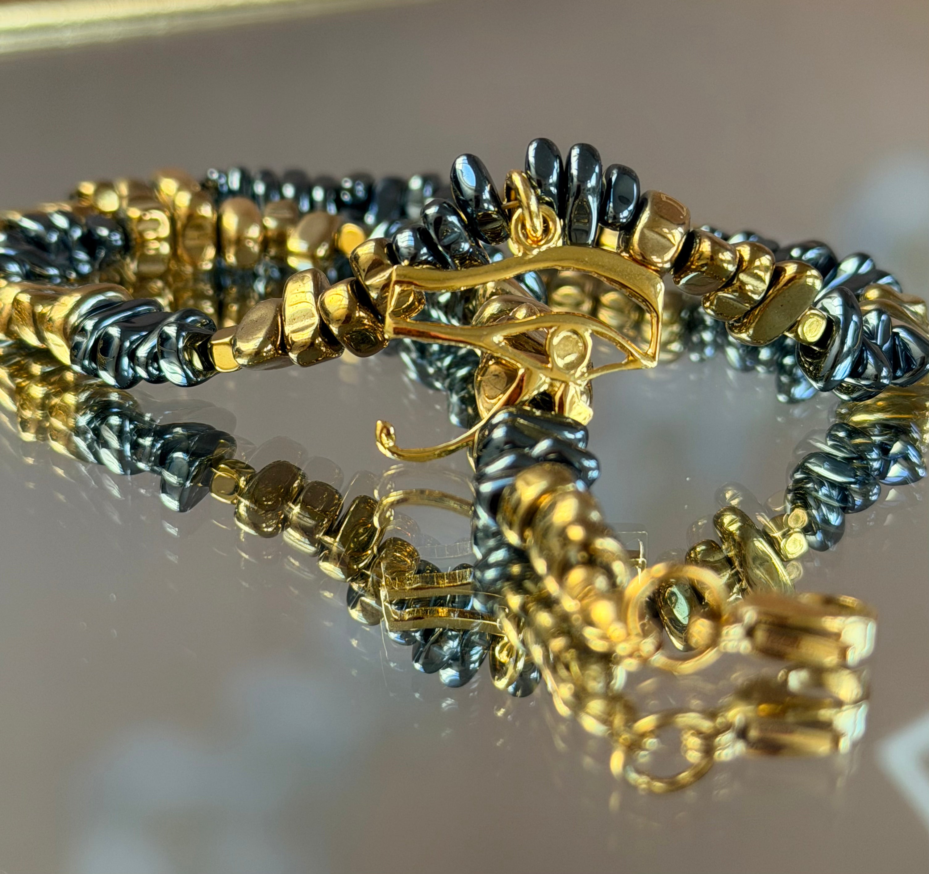 A captivating blend of elegance, protection, and modern design. This handcrafted necklace features irregular gold and dark grey hematite gemstones, known for their natural metallic shine and grounding energy.