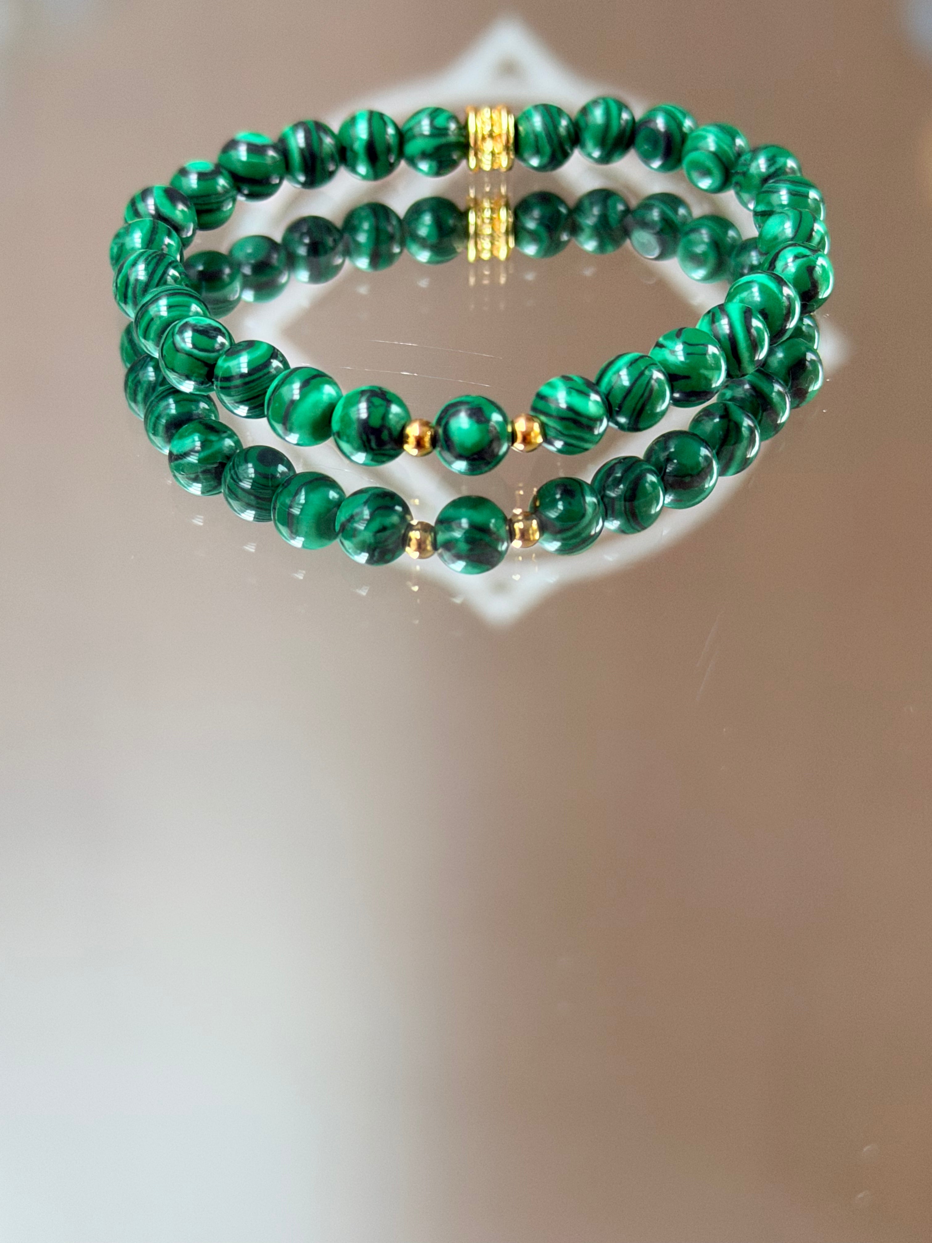 A refined and vibrant design crafted from 6mm malachite gemstones, each displaying the stone’s signature rich green colour and natural banding. Known for its striking patterns and protective energy, malachite brings a touch of elegance and depth to any look.