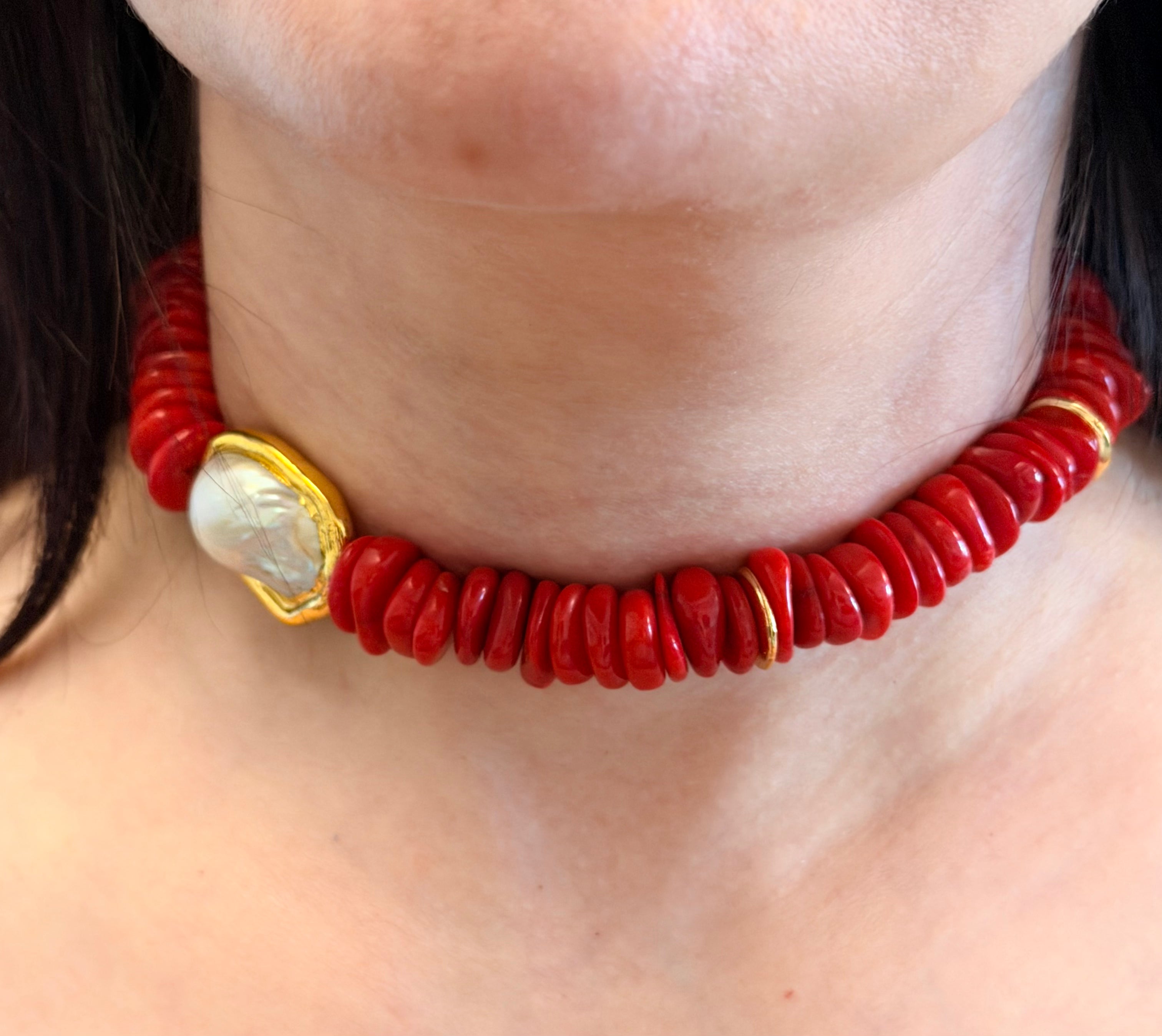 This striking necklace features natural irregular coral gemstones, each uniquely shaped to highlight their organic beauty and rich, vibrant red tone. A luxurious gold-plated baroque freshwater pearl sits elegantly to one side, adding contrast and sophistication to the design. Finished with an 18K PVD gold-plated clasp, this piece blends bold colour with contemporary elegance—perfect for making a refined statement.