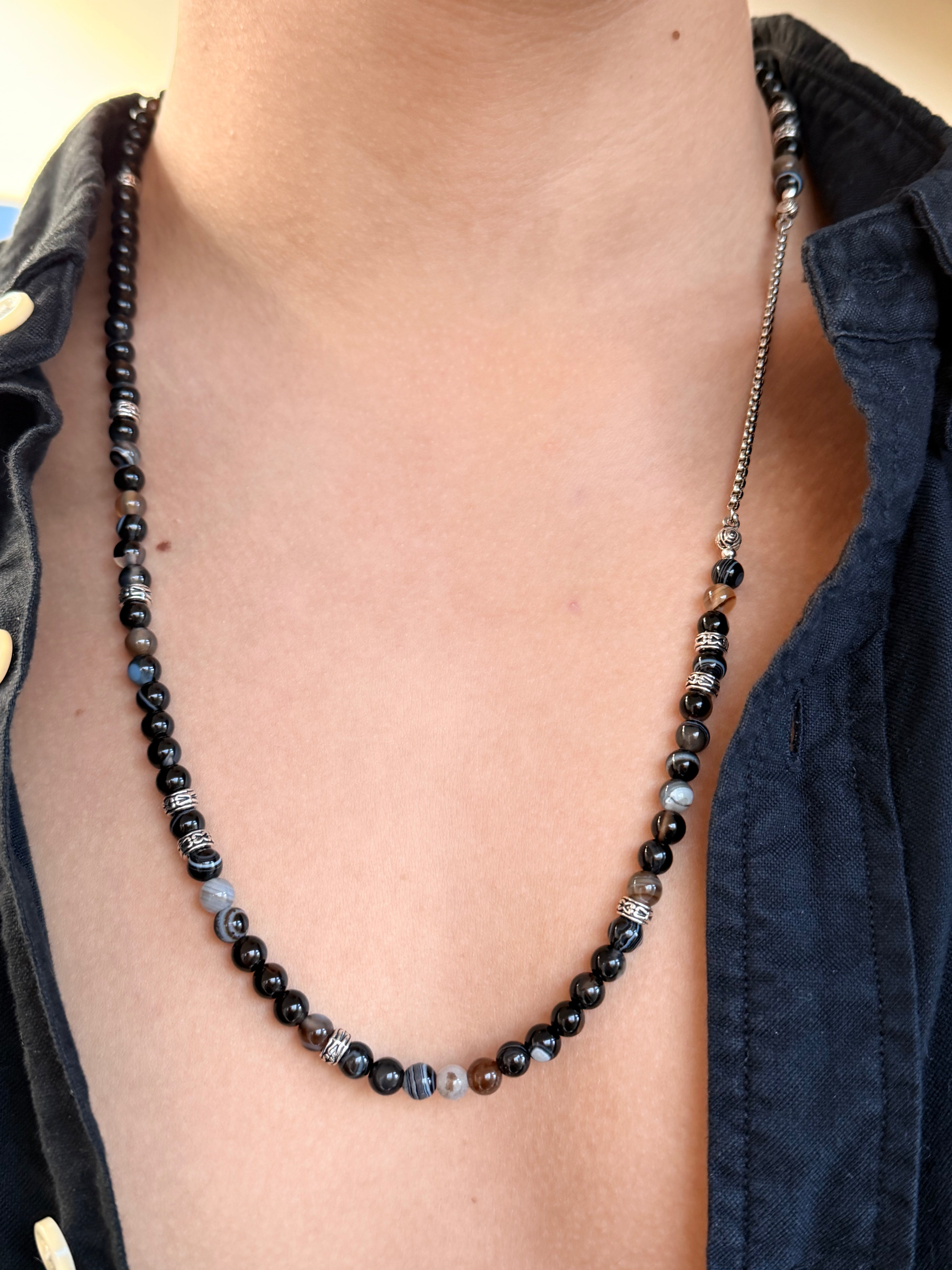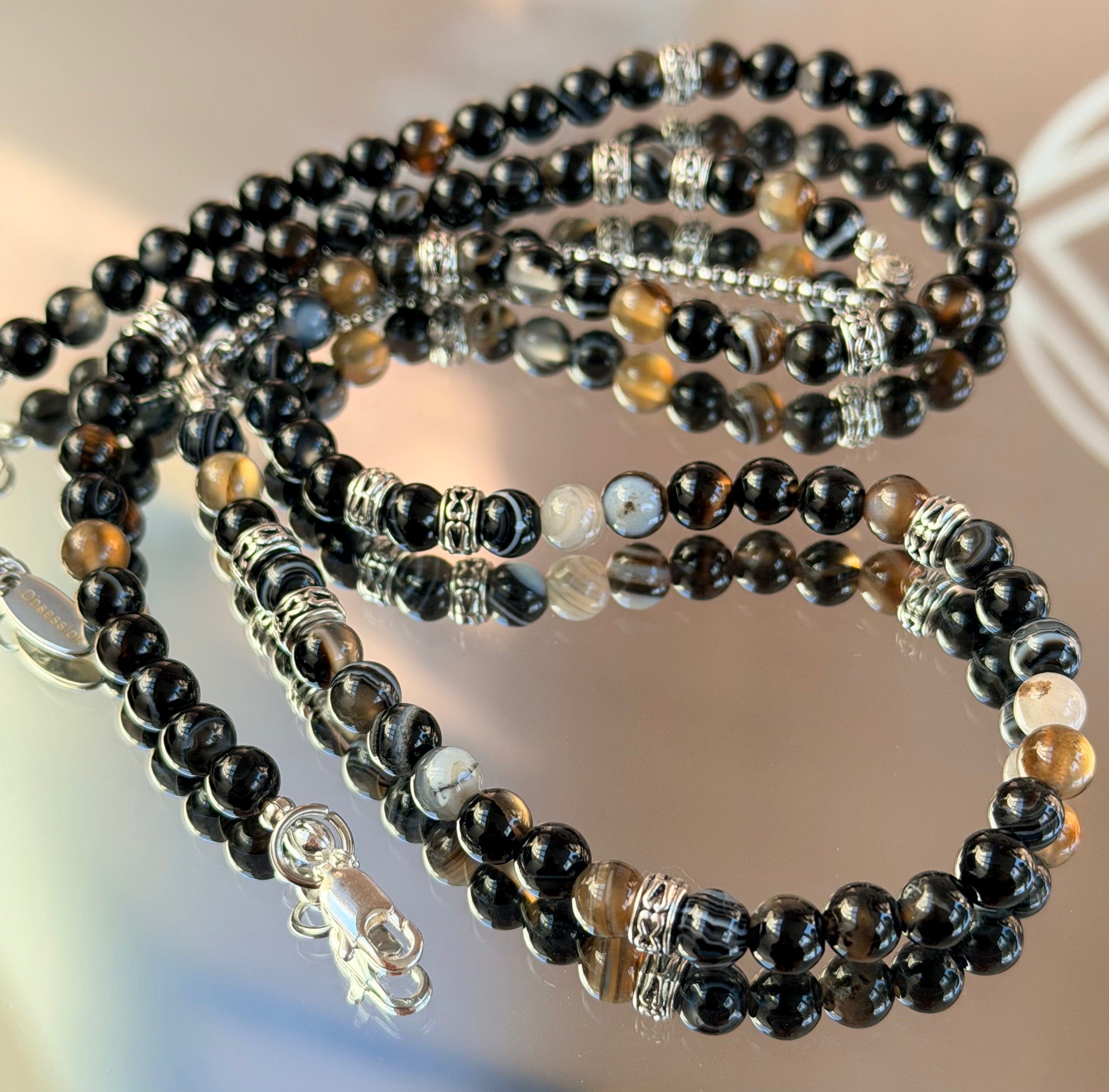 This men’s necklace features high-quality 6mm Sulemani Agate (عقيق سليماني), known for its distinctive banded patterns in deep blacks, smoky greys, and earthy tones. Every stone is naturally unique, giving each piece its own character.